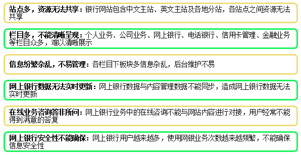 由于金融业的特殊性,金融业网站往往不孤立存在,通常由金融主网站及各支行、分行网站共同构成,这也造成了金融网站在信息共享、信息更新及信息维护上的诸多问题。