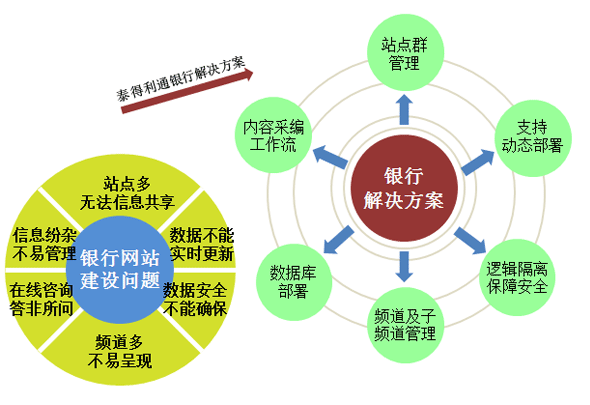 泰得文通金融解决方案包含独特的数据库部署技术,将内容管理系统中的业务内容部署到网银业务应用系统指定的数据库中,从而方便业务应用系统提供在线业务咨询搜索服务。