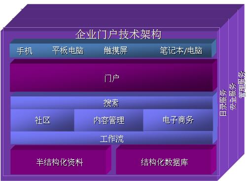 企业门户是一个联接企业内部和外部的网站,它可以为企业提供一个单一的访问企业各种信息资源的入口,企业的员工、客户、合作伙伴和供应商等等都可以通过这个门户获得个性化的信息和服务。企业门户可以无缝地集成企业的内容、商务和社区:首先,通过企业门户,企业能够动态地发布存储在企业内部和外部的各种信息;其次,企业门户可以完成网上的交易;此外,企业门户还可以支持网上的虚拟社区,网站的用户可以相互讨论和交换信息。