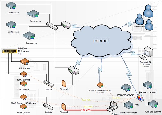 CMS生成的网站为全静态网站,在发送到WEB缓存中指定的源服务器后,通过WEB缓存集群来获取,提供给互联网的访问者来访问。WEB缓存集群可以根据需要动态的添加节点。